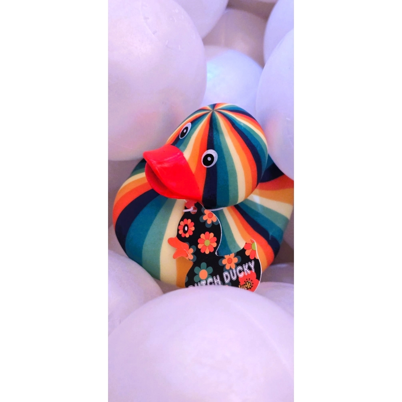 Hol dir das Lebensgefühl der 70er-Jahre ins Badezimmer mit dieser farbenfrohen Groovy Retro Badeente! Mit fröhlichen Regenbogenstreifen und einer großen Portion Flower Power ist sie ein echter Hingucker und zaubert Jung und Alt ein Lächeln ins Gesicht.