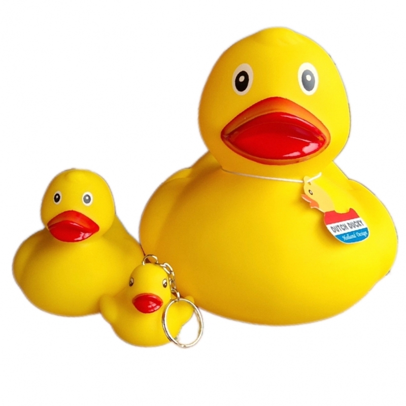 Gelbe gummi ente, höhe 8 cm. Auch als Schlüsselanhänger und in einer 15 cm Variante erhältlich