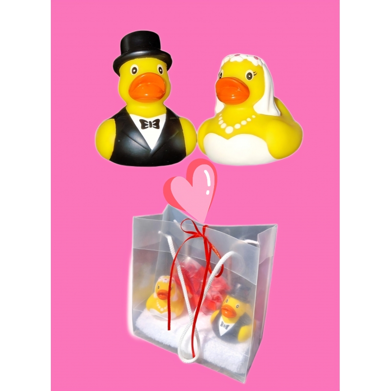 Schön als Dekoration bei einer Hochzeit oder als geschenk für die Hochzeitsgäste. Auch können wir Ihren Namen und Datum der Hochzeit auf dieser Ente drucken. Diese Braut Gummiente wird in einer transparenten Box geliefert.