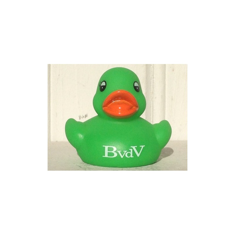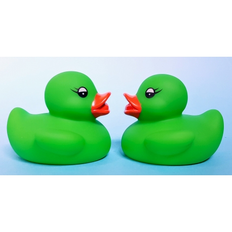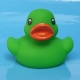 Kostengünstige grüne Gummi-Ente von etwa 5 cm hoch.