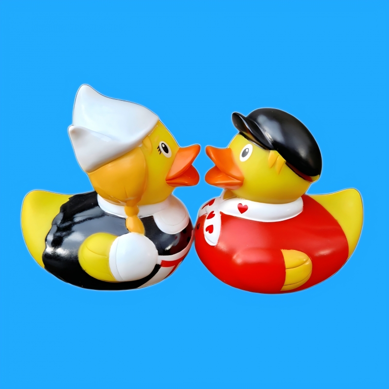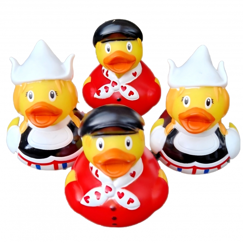 Lernen Sie diesen fröhlichen niederländischen Erpel kennen – komplett in traditioneller Tracht! Mit seiner schwarzen Mütze, dem roten Outfit und dem Halstuch voller Herzen watschelt er direkt in Ihr Badezimmer hinein. Und… es gibt auch eine hübsche weibliche Variante namens Klassien.