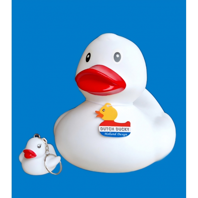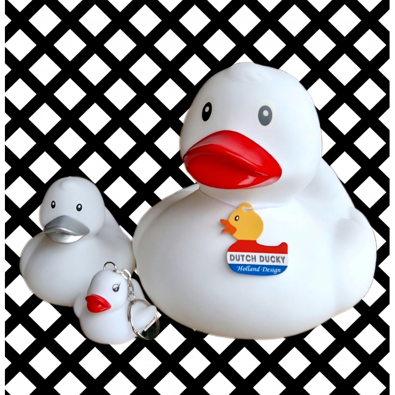 A fun white XL rubber duck that is 15 cm tall, simple, cheerful, and a real eye-catcher in the bath or on display.