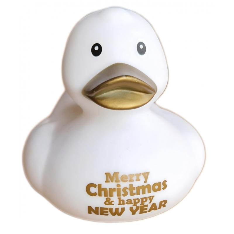 Celebrate the holidays with this elegant white Christmas rubber duck. This cheerful Christmas duck features a stylish white color, a golden beak and the text “Merry Christmas & Happy New Year” on its belly. Perfect as a Christmas gift, fun holiday decoration, or a great addition to any rubber duck collection.