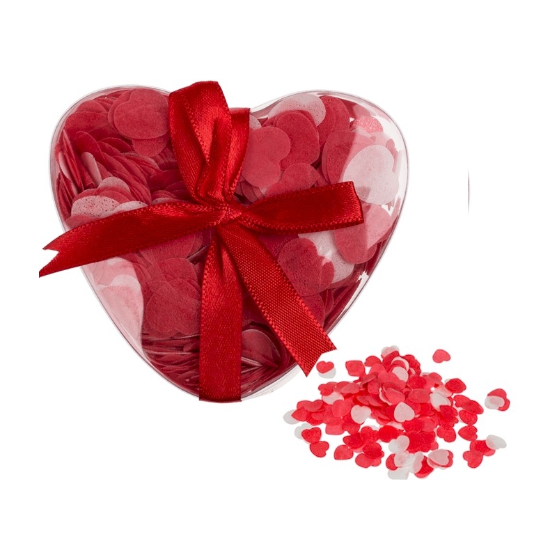 The bride rubber duck is 5.5 cm high and the groom rubber duck is 6.5 cm. The box of the heart confetti is about 7 cm high, and contains 20 grams of confetti hearts, that are about 1.5 cm in size.