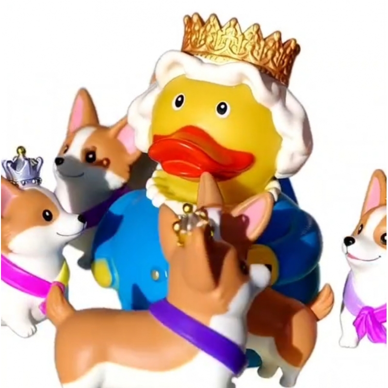 This royal rubber duck depicts Queen Elizabeth together with one of her beloved Corgi dogs – a breed she was famously fond of. A majestic pair for your bath!