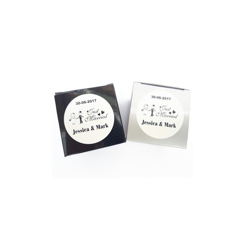 Make your wedding thank you gift personally with this sticker. Great with the just married duck. We will first mail a digital image of the adjusted sticker. After your approval the stickers will be made. You buy them per sheet of 24 pieces. Special wishes? Let us know.