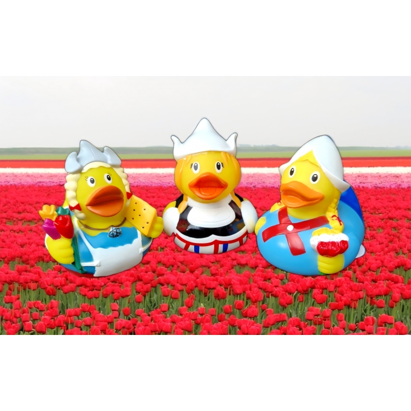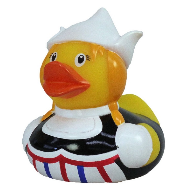 This cheerful Dutch rubber duck is ready to brighten up your bath with her adorable traditional Dutch outfit! With her cute white bonnet and colorful dress, she looks like she just waddled over from a tulip field. And guess what… she’s not alone! There’s also a dashing male version named Hendrik.