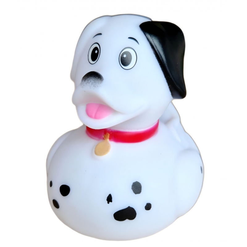 Deze schattige dalmatiër-badeend steelt gegarandeerd je hart! Met zijn lieve blik, rode halsband en grappige vlekjes brengt hij vrolijkheid in elk bad.