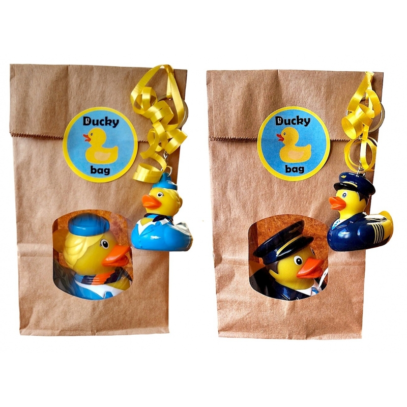 Geen doggy bag maar een DUCKYbag! In deze piloot DUCKYbag zit 1 piloot badeend van 9,5 cm en een sleutelhanger piloot met een hoogte van 5 cm.