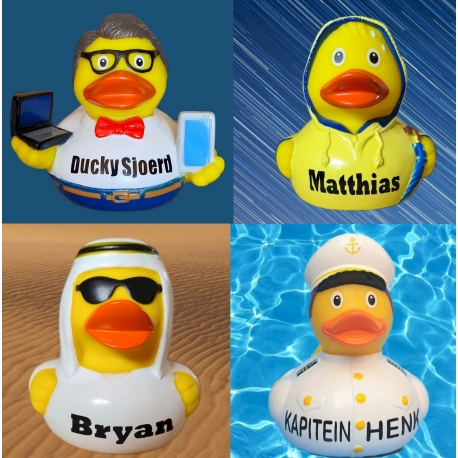Wij hebben heel veel eendjes op onze site die we persoonlijk kunnen maken door er een waterbestendige sticker op te plakken met naam of tekst. De kosten daarvoor zijn €6,-