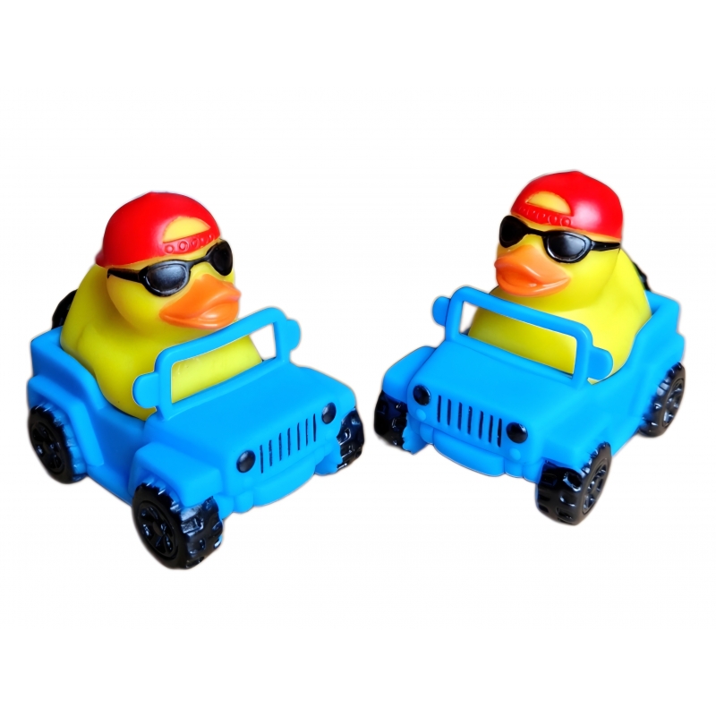 Deze stoere badeend in Jeep is klaar voor avontuur. Met rode pet en zonnebril rijdt deze originele badeend in een opvallende blauwe Jeep en is hij een echte blikvanger in elke badeendcollectie.